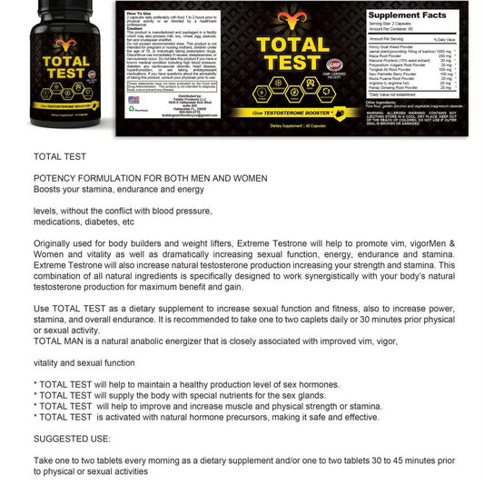 Total Test Testosterone Booster 60 Capsules 1500Mg USA Made Energy Libido Increase