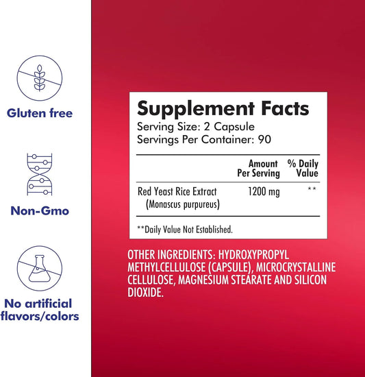 Red Yeast Rice, Dietary Supplement, 1200 Mg per Serving, 180 Capsules, Non-Gmo, Gluten Free, No Artificial Flavors